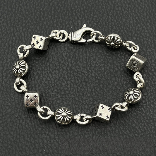 Vintage Silver Bracelet Sword Cross Flower Ball Dice Distinctive Motif Craft