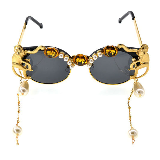 Women's Stylish Carved Monkey Pearl Crystal Sunglasses European Fashion Eyewear