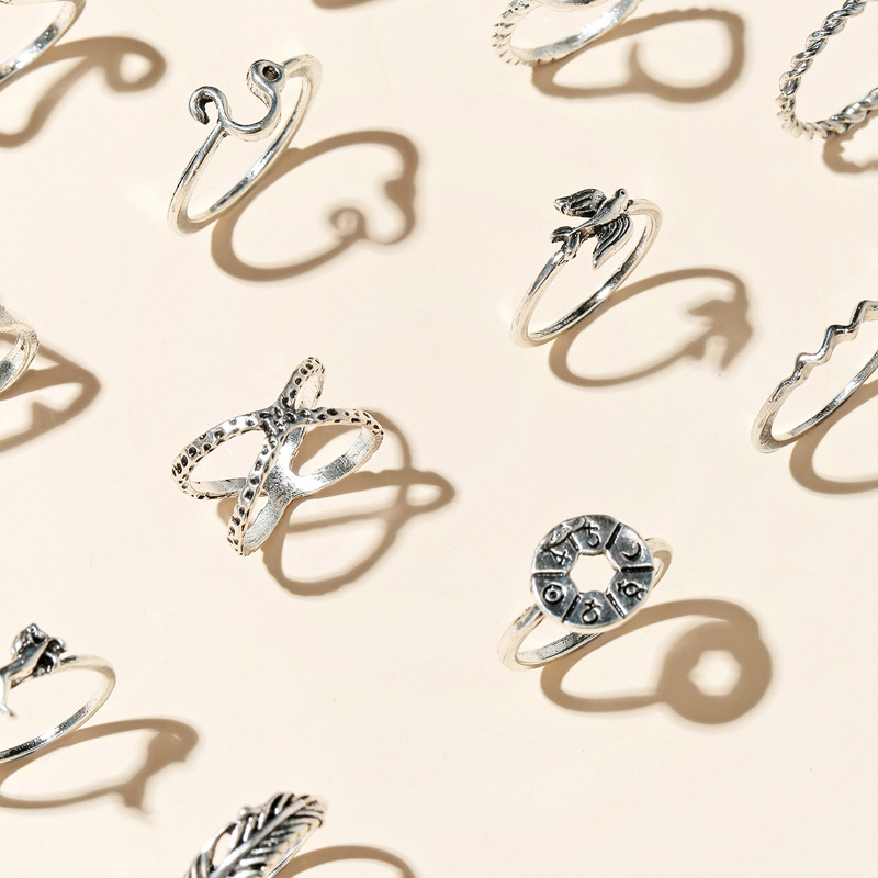 12pc Midi Ring Set Silver Vintage Design Moon Feather Rings Jewellery