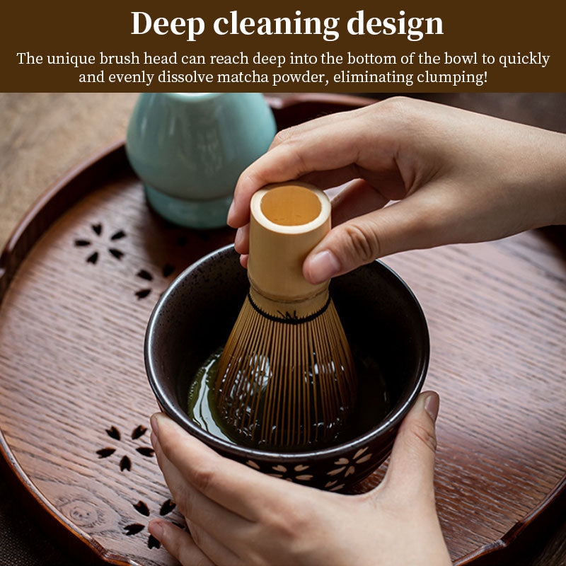 This authentic Japanese Chasen, meticulously handcrafted from bamboo, is essential for preparing traditional matcha tea. The design features a premium bamboo handle paired with 70 natural bristles, ideal for achieving a perfectly frothy matcha. Its unique brush head is engineered to reach deep into the bowl, ensuring quick and even dissolution of matcha powder without clumping. This tool not only enhances the ritual of matcha brewing but is also practical for everyday use, designed for deep cleaning to maintain hygiene and longevity.