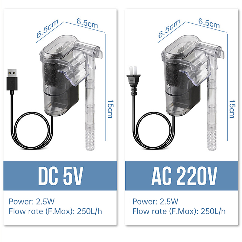 USB or Plug Aquarium Filter 2.5W 250L/H Small Tank Water Purifier 30cm Max Size